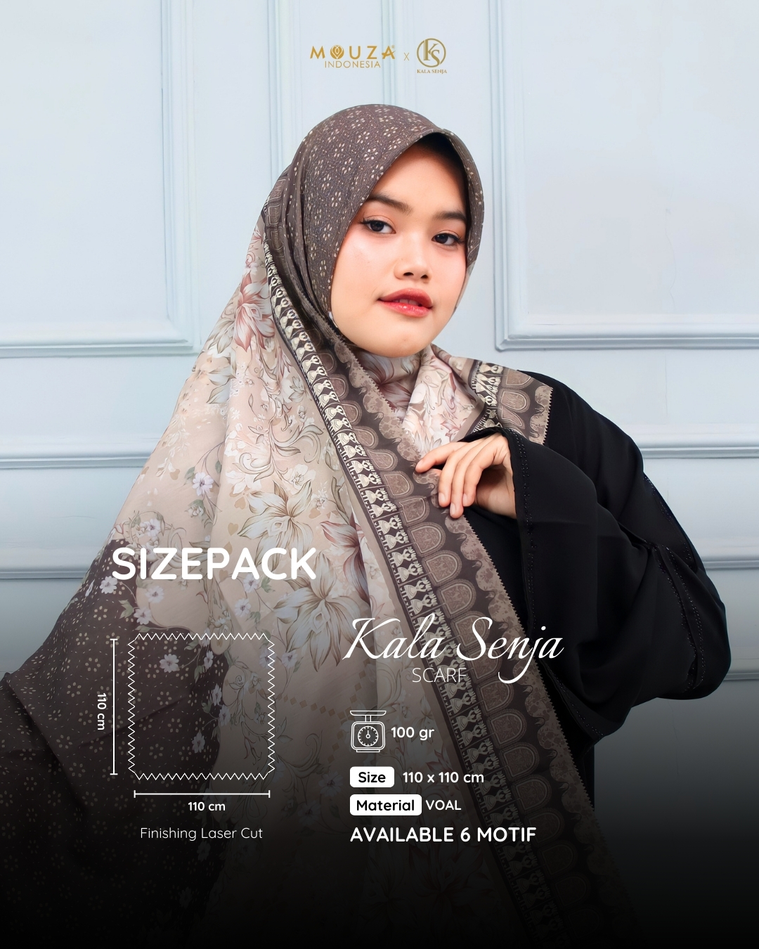 Kala Senja Scarf terbuat dari bahan Voal memiliki tekstur yang halus dan ringan. Sehingga adem, lembut, dan sangat nyaman dipakai.