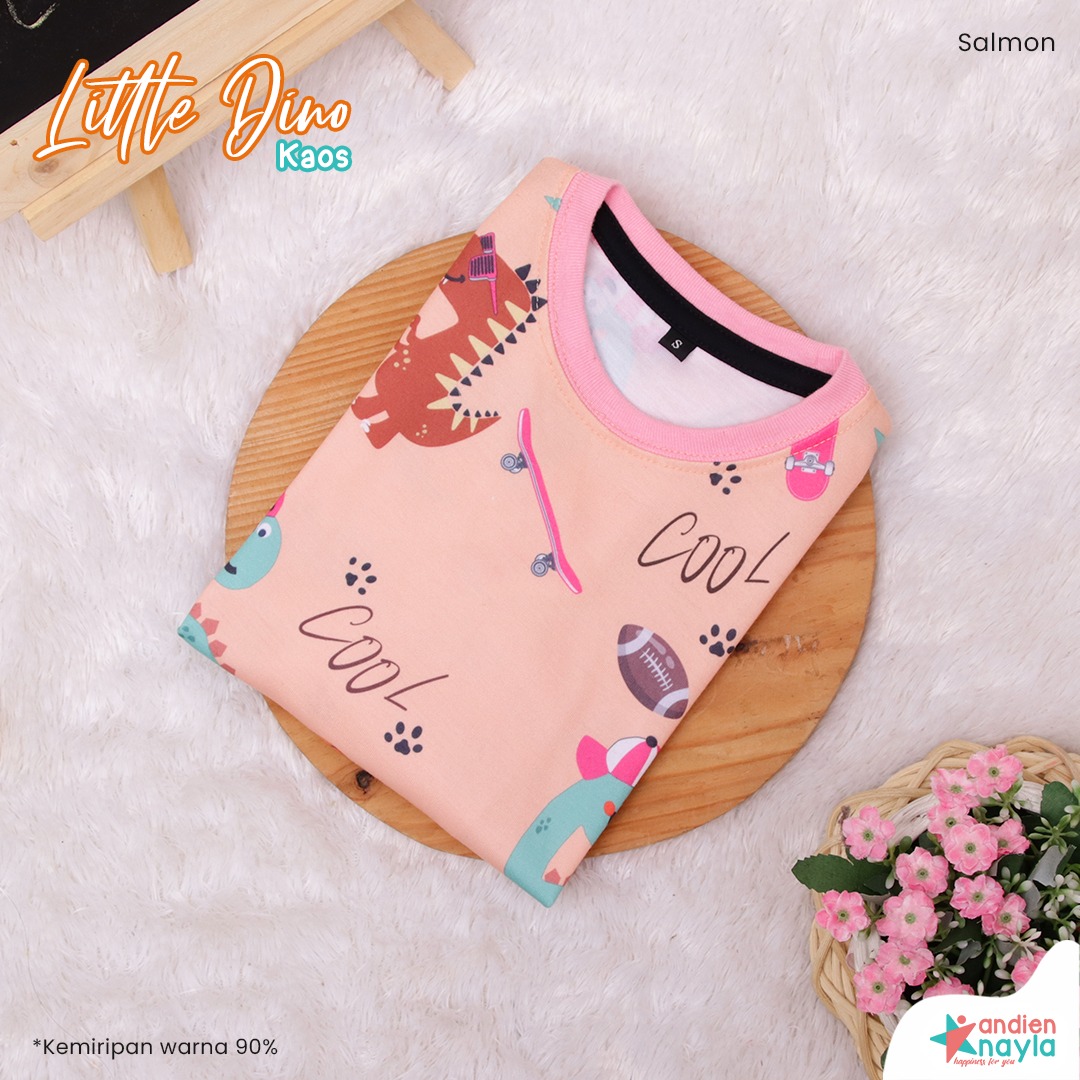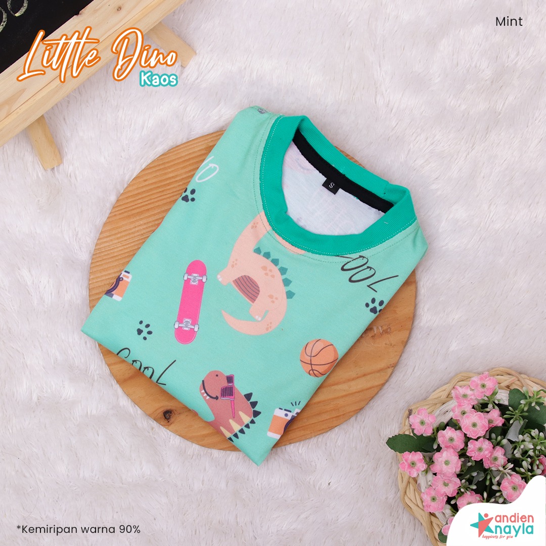 Gambar motif bertemakan dinosaurus yang lebih bervariatif dari kaos dino sebelumnya membuat tampilan si kecil semakin lucu dan menggemaskan.