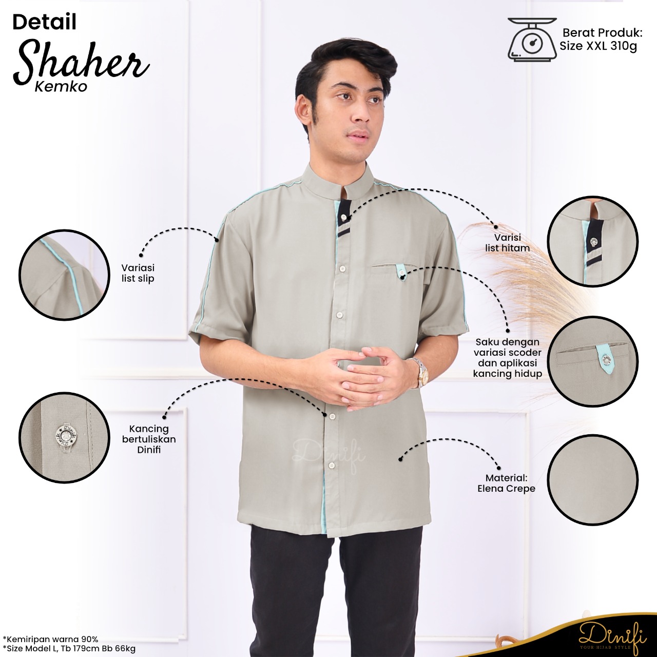 Terdapat kancing yang dapat menyesuaikan bentuk tubuh ketika akan dikenakan. Kancing bertuliskan Dinifi membuat kemko ini semakin eksklusif.