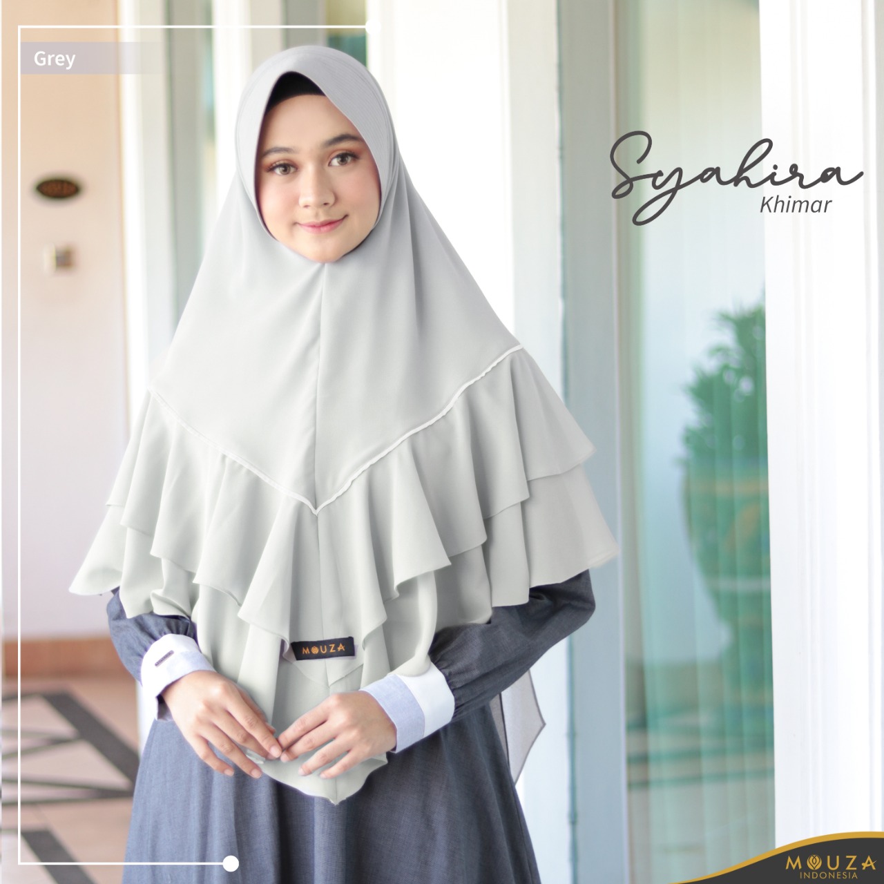 Bagian depan sambungan di dada dibuat 2 lapis membuat khimar ini jatuh bergelombang cantik dengan variasi list berwarna abu membuat penampilan semakin menawan.