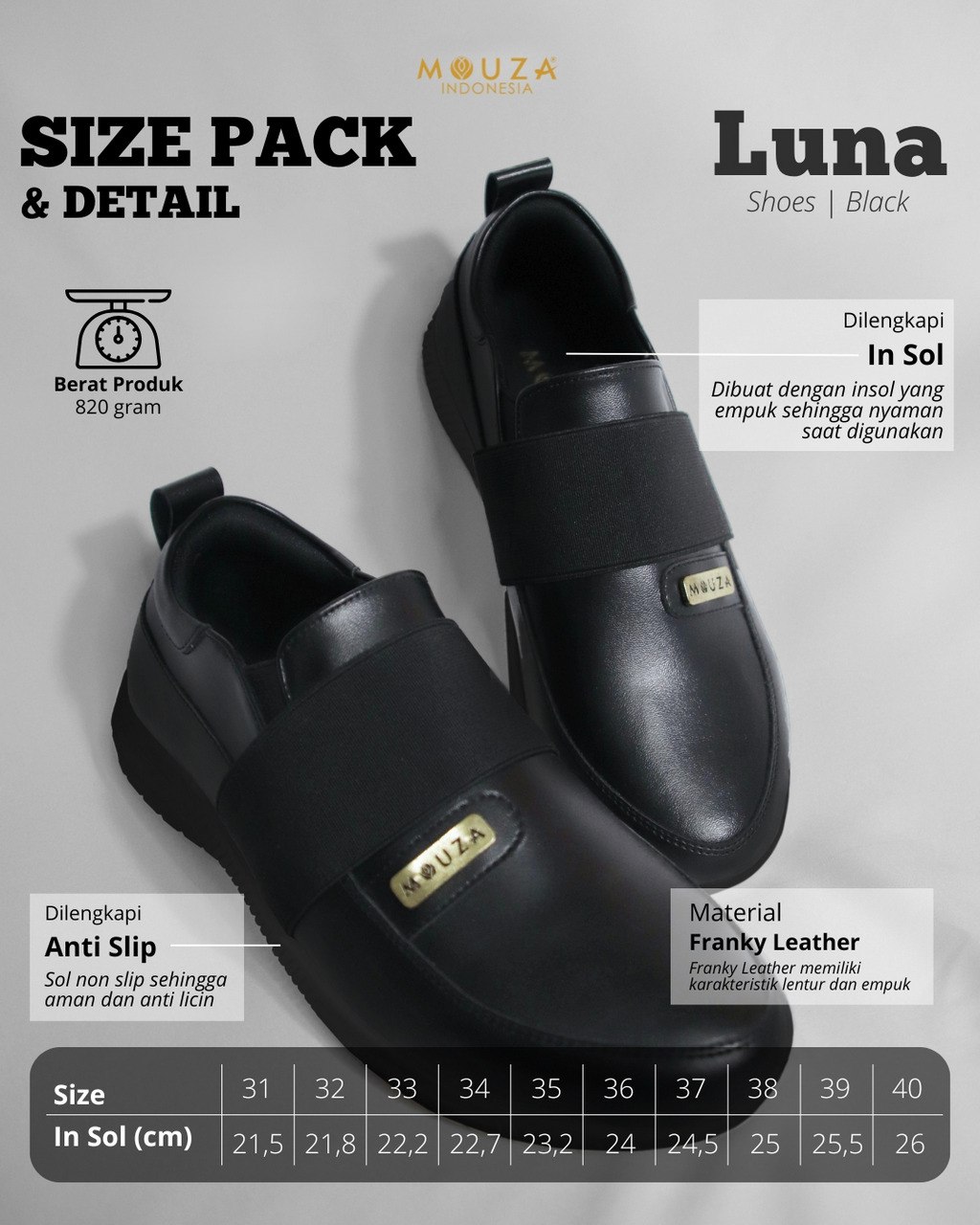 Luna shoes dibuat dengan material franky leather synthetic yang karakteristiknya lentur dan empuk membuat sepatu ini nyaman saat digunakan