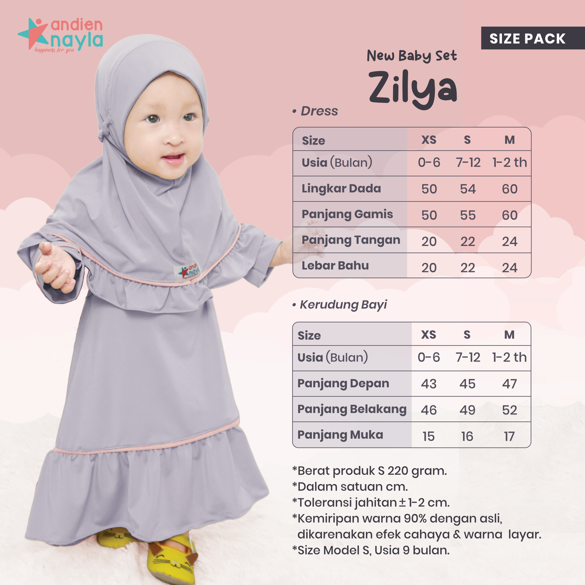 - Tedapat variasi frill di bagian hijab dan bagian bawah baju yang akan terlihat lebih anggun