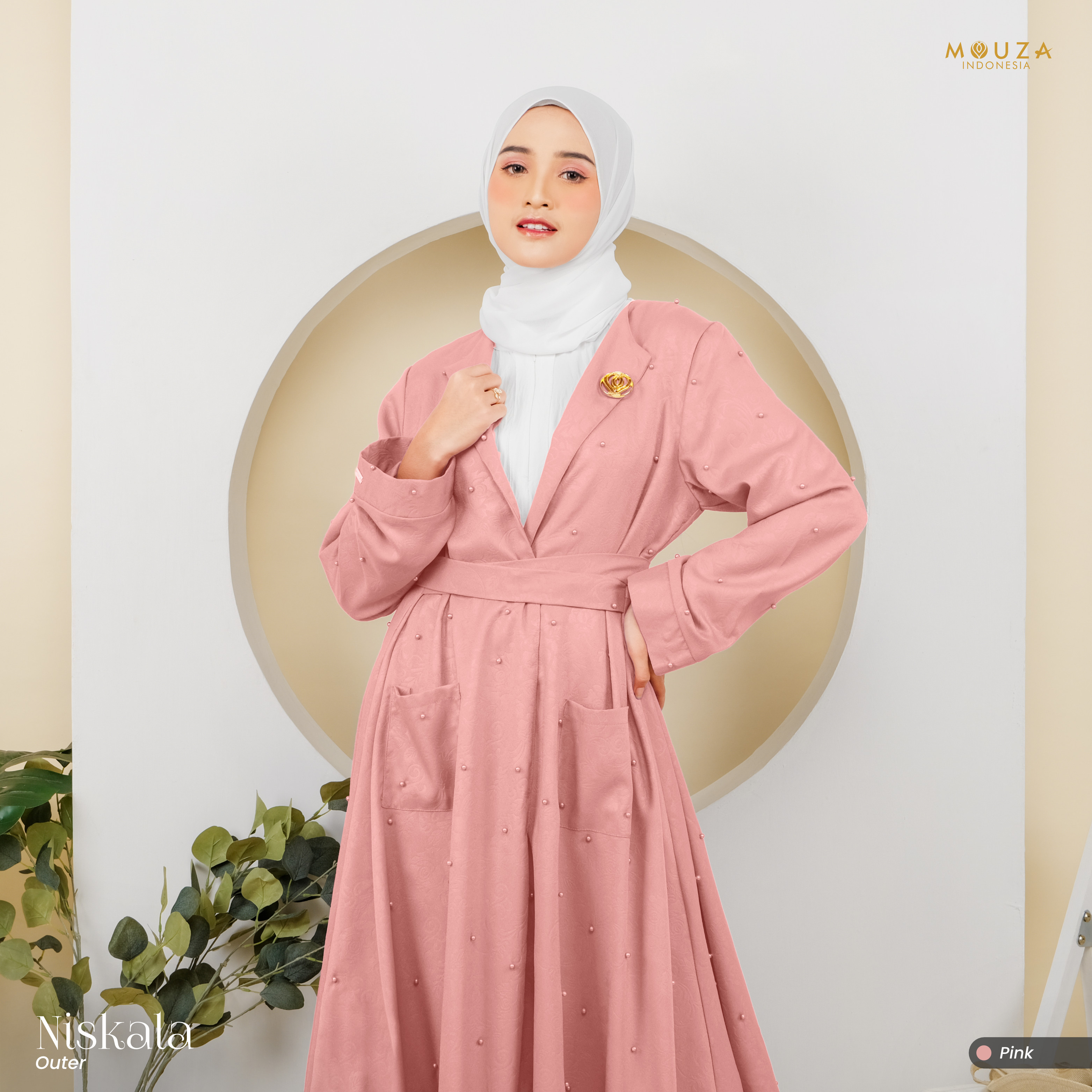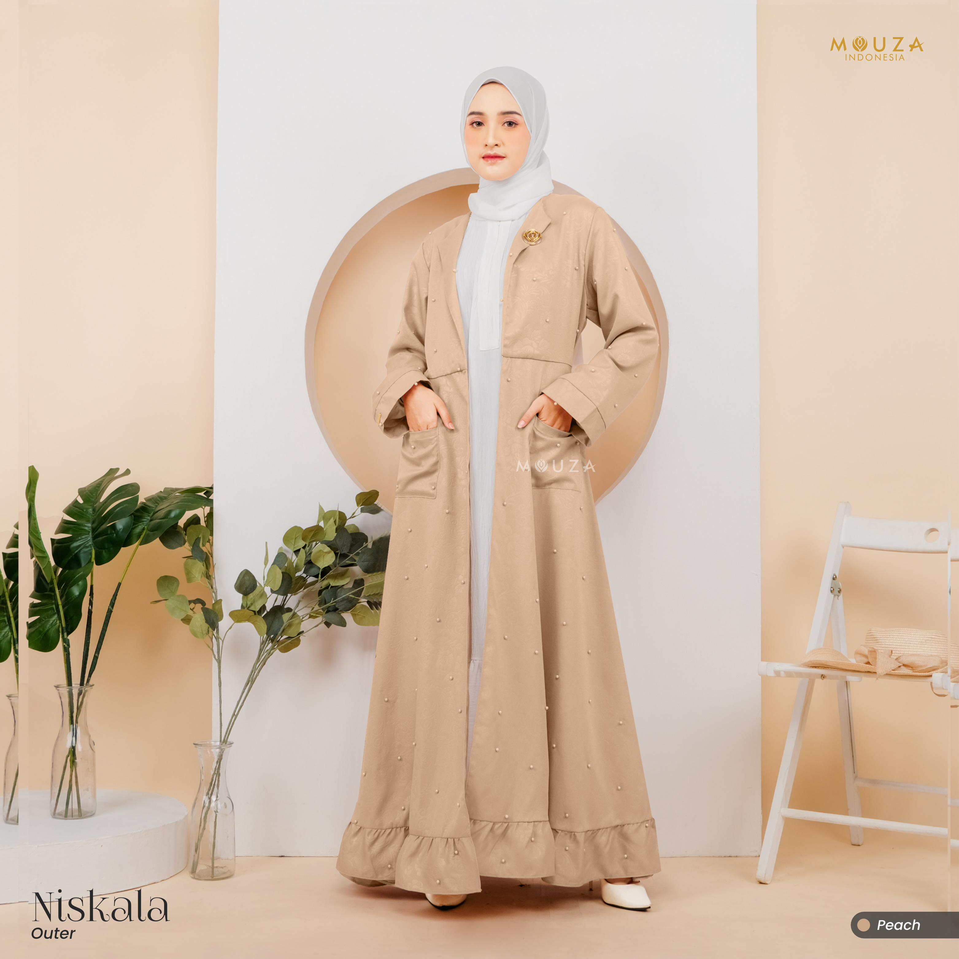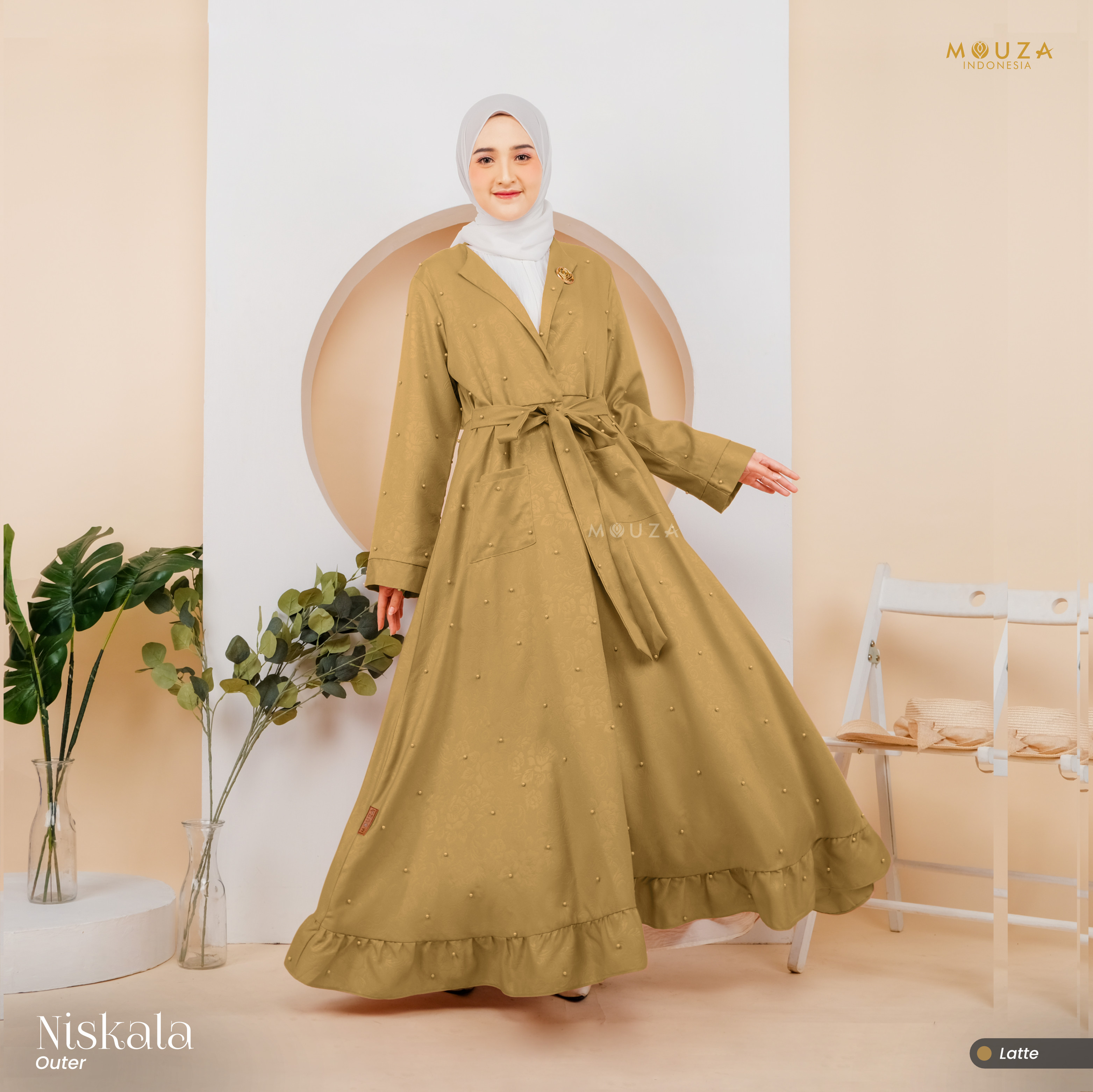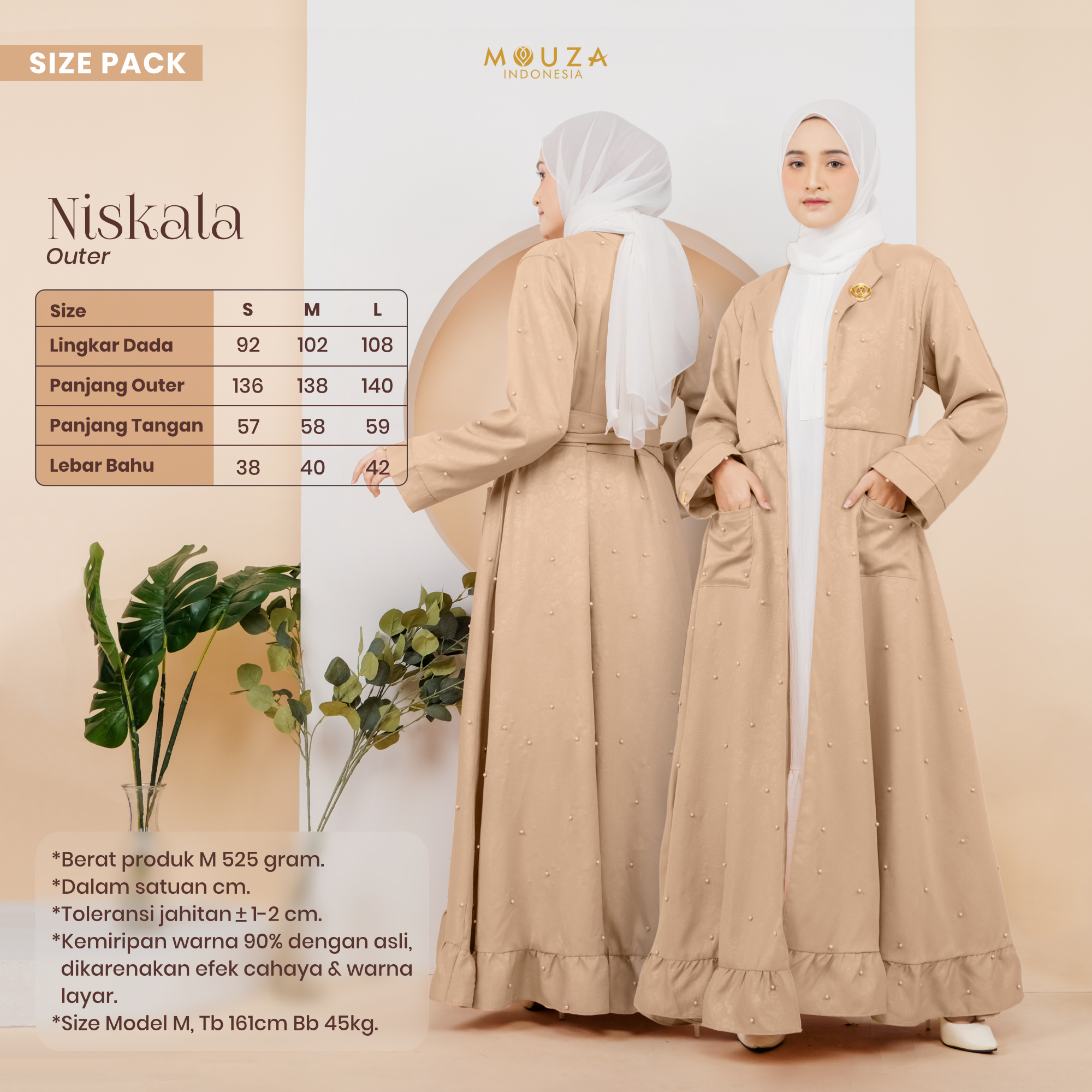 ? Menggunakan material Mosecrepe Embos Mutiara dengan karakteristik bahan yang lentur, nyaman, sangat mudah disetrika, mengkilap dan terkesan elegan dengan tambahan variasi mutiara yang dipadukan dengan brukat Vanci Gliter yang membuat outer ini tampak lebih mewah.