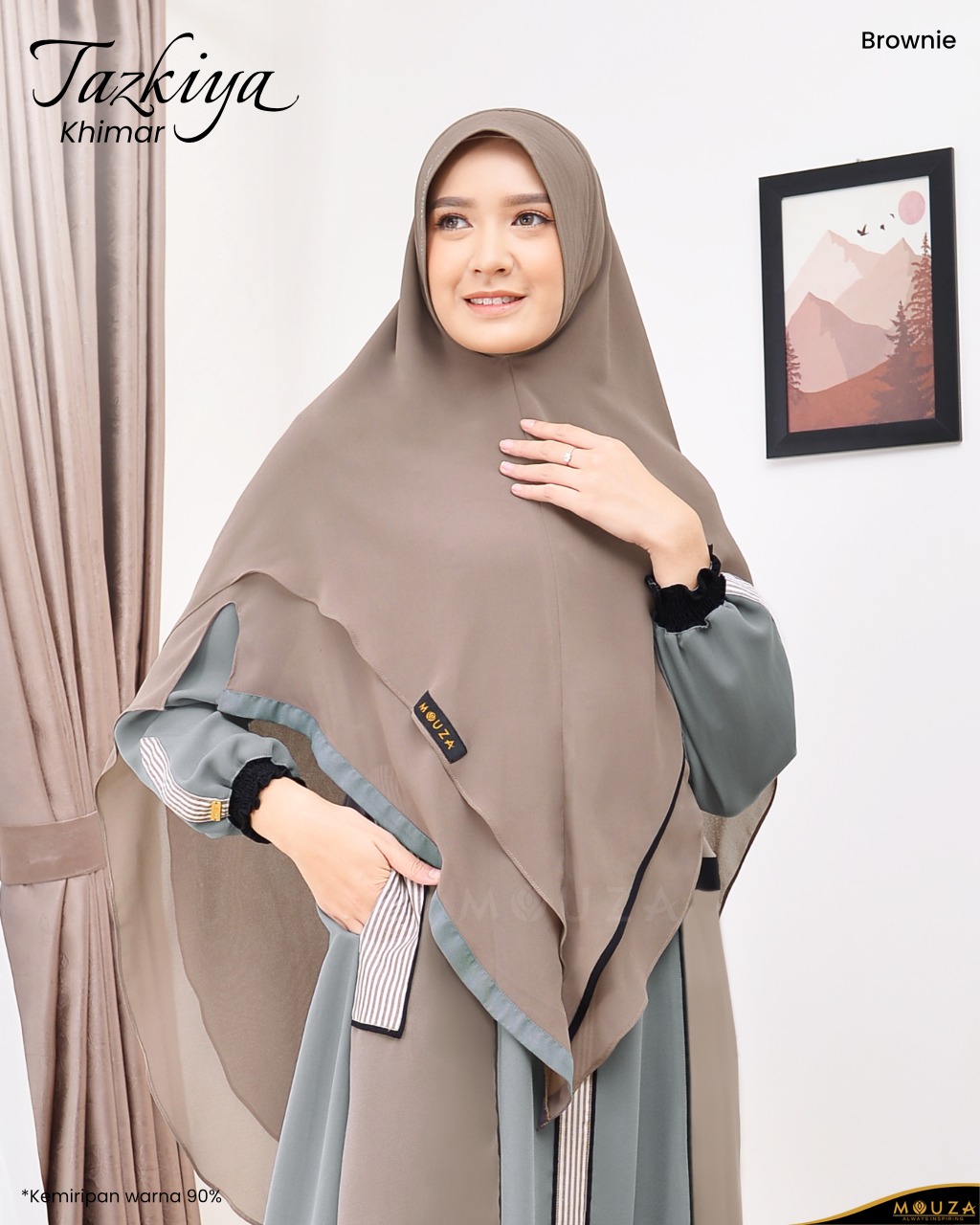Terdapat variasi list dan bisban di bagian depan khimar dan variasi swarovski di bagian pet bertuliskan Mouza.