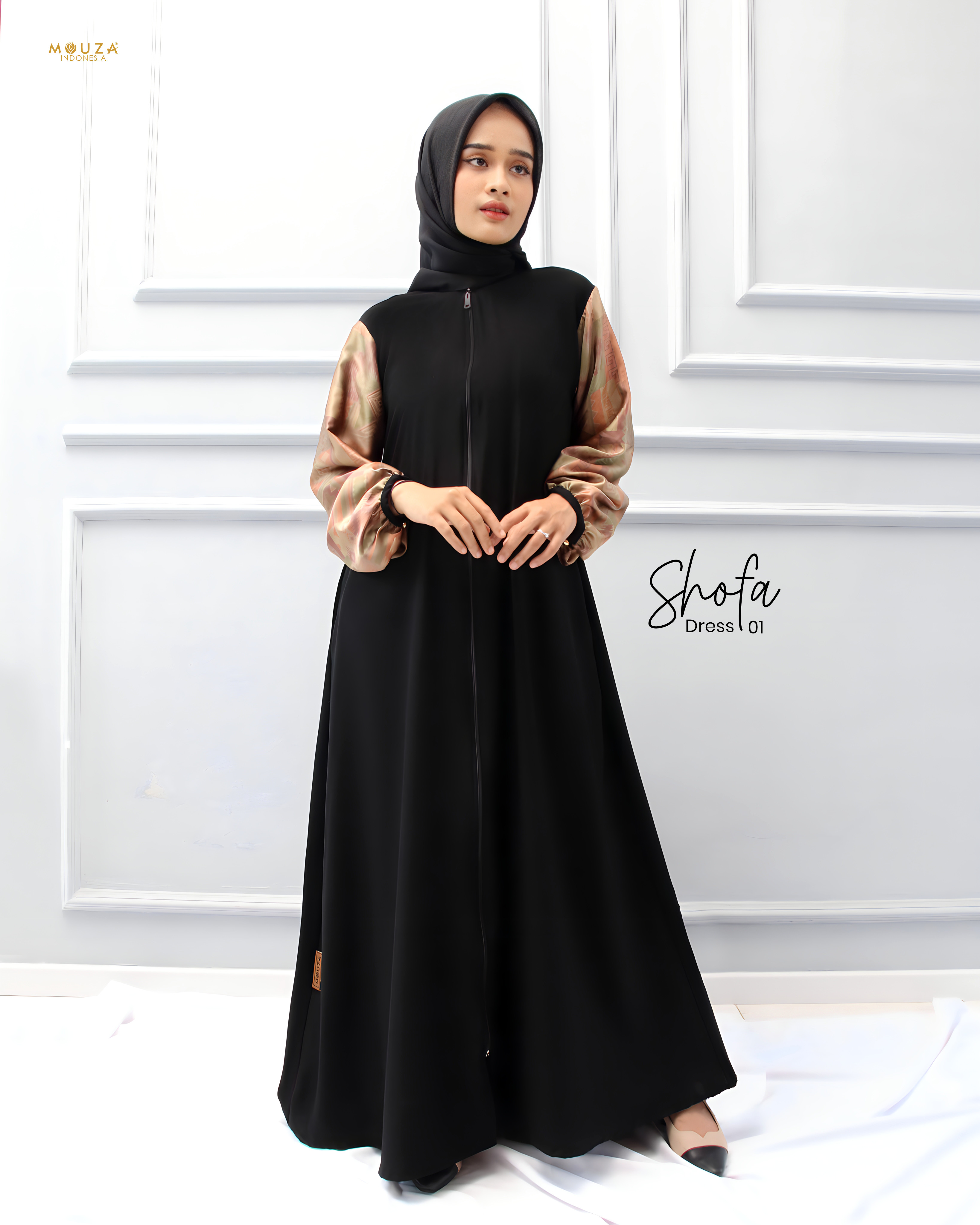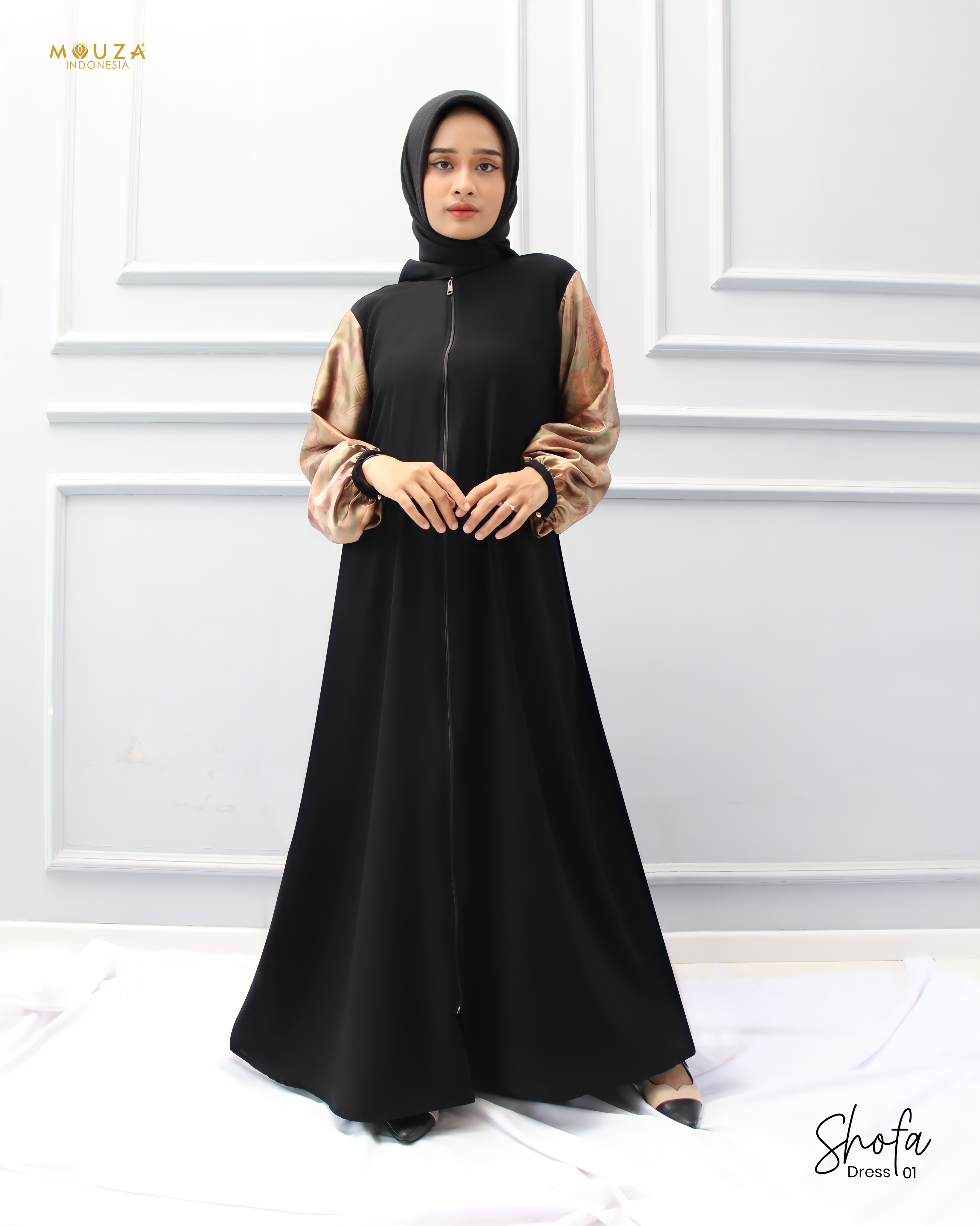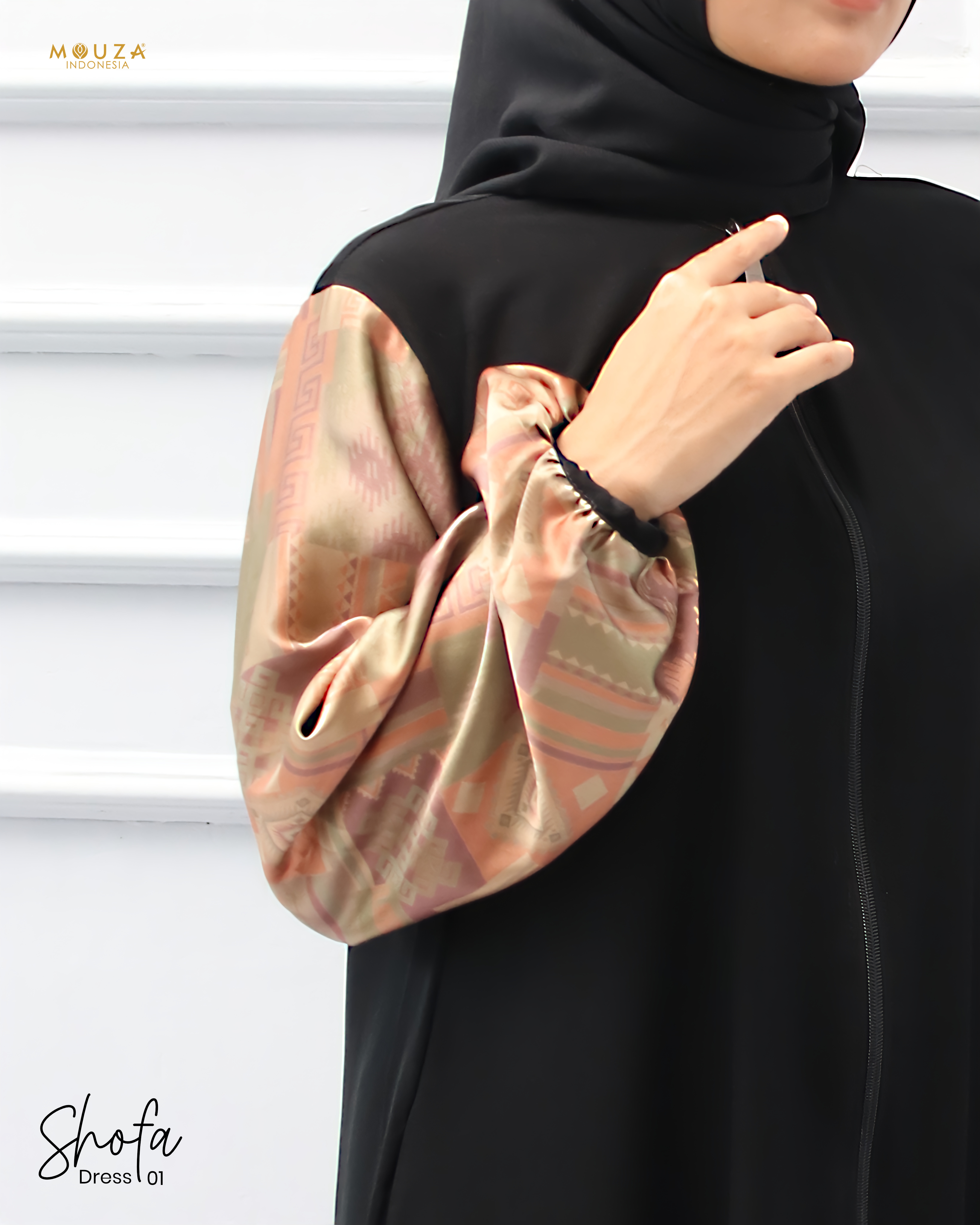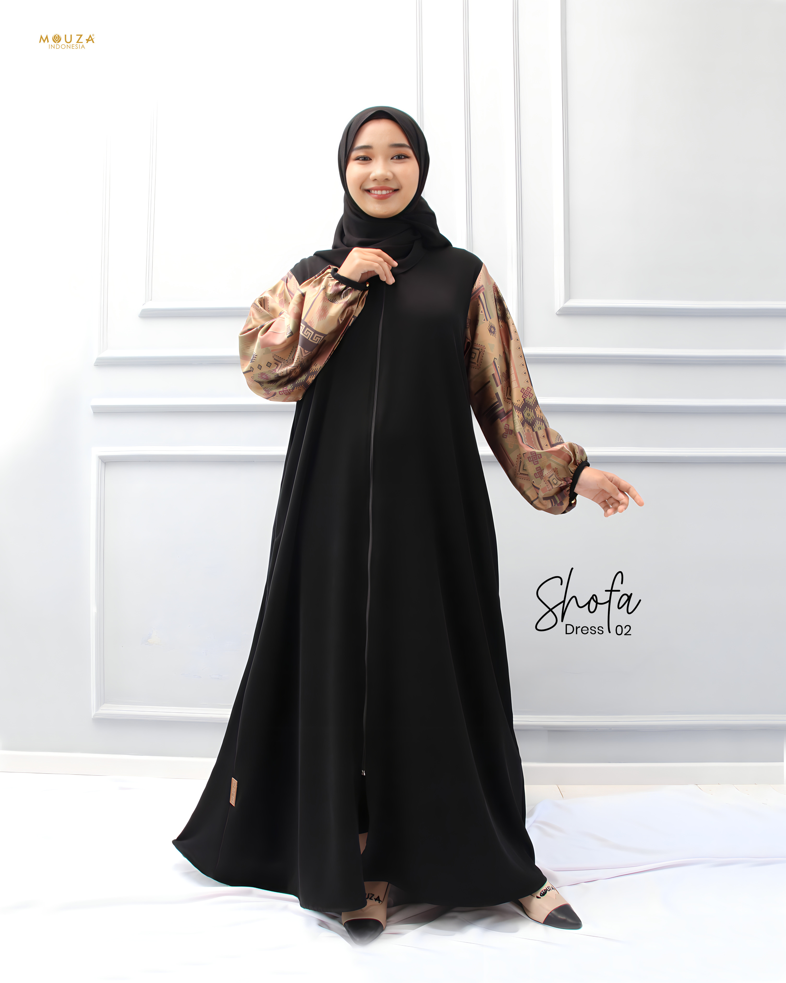 Shofa Dress menggunakan material pokka jetblack dengan karakteristik mempunyai serat yang lembut, adem dan mempunyai warna hitam pekat yang solid.