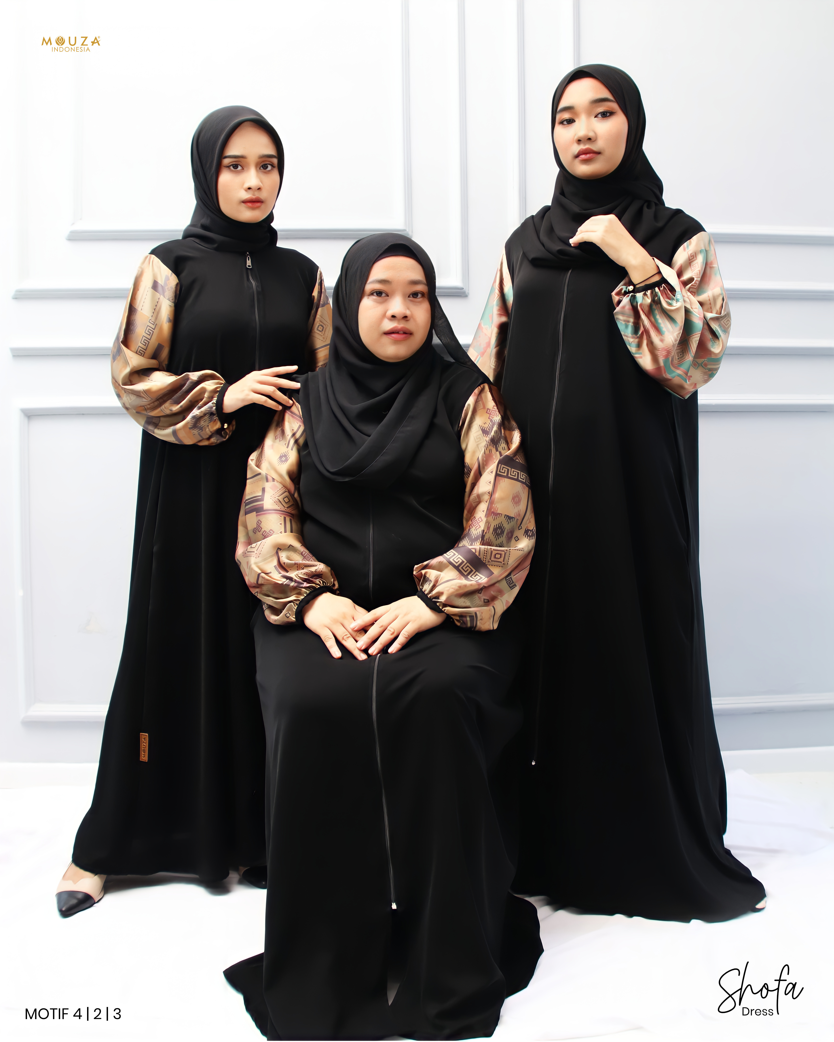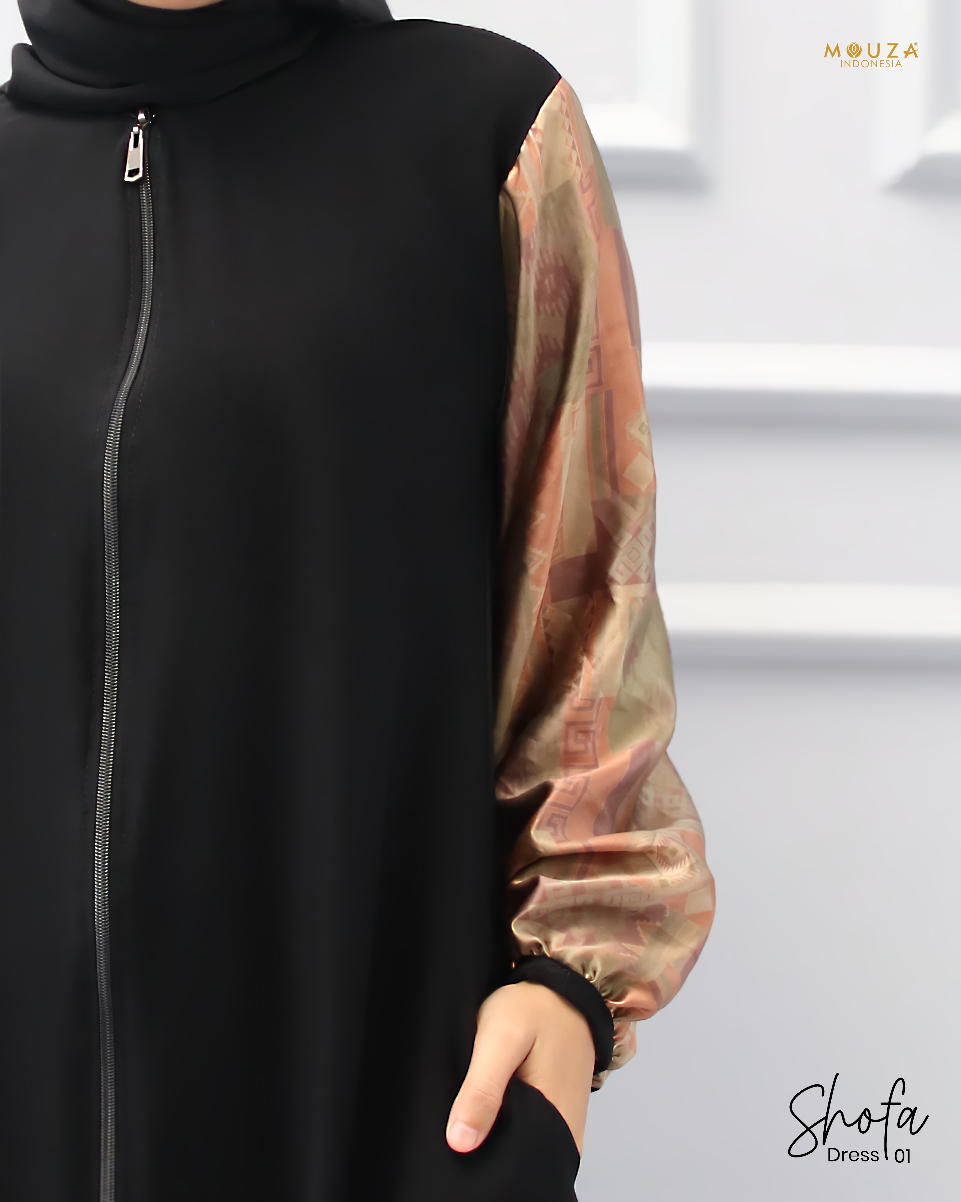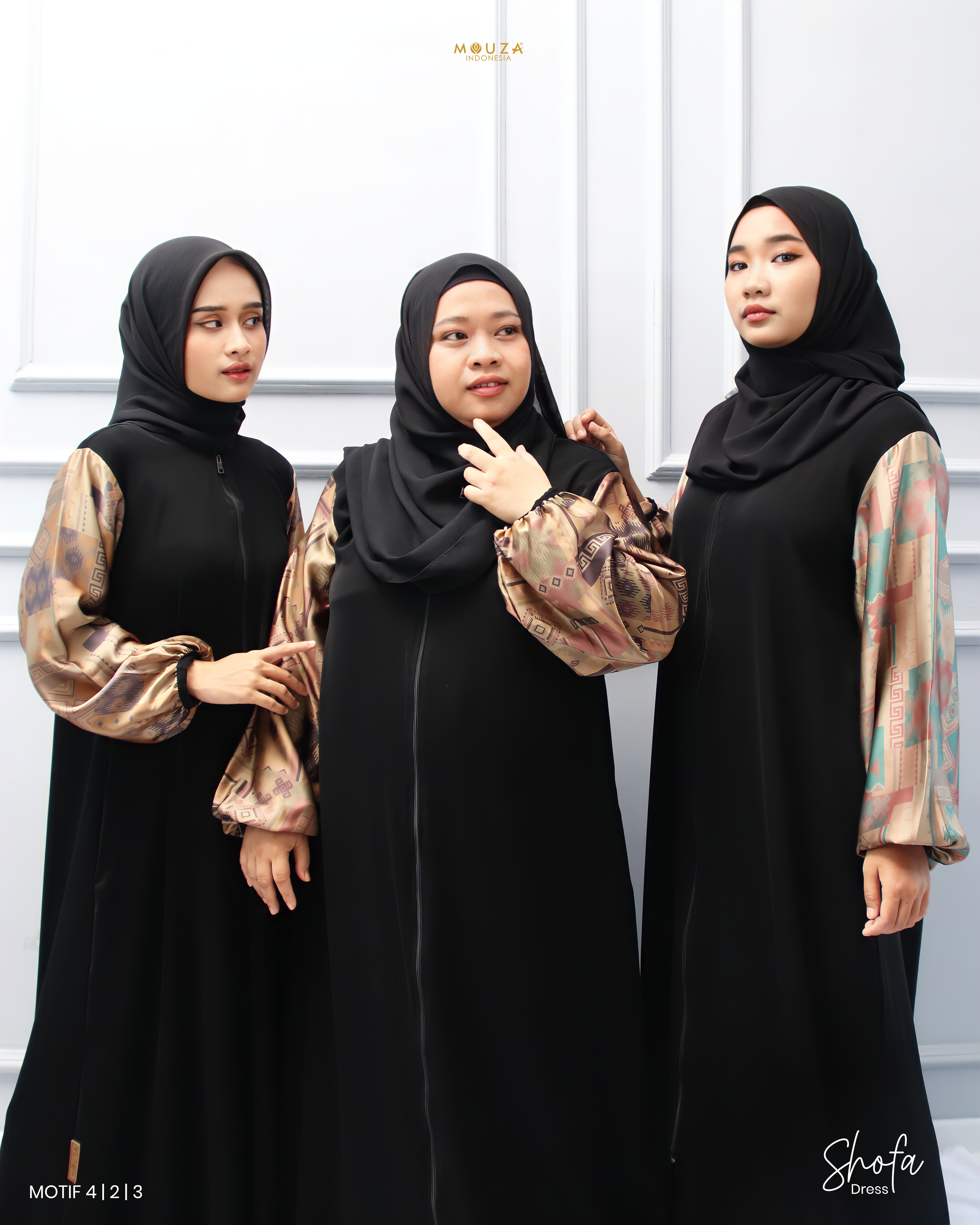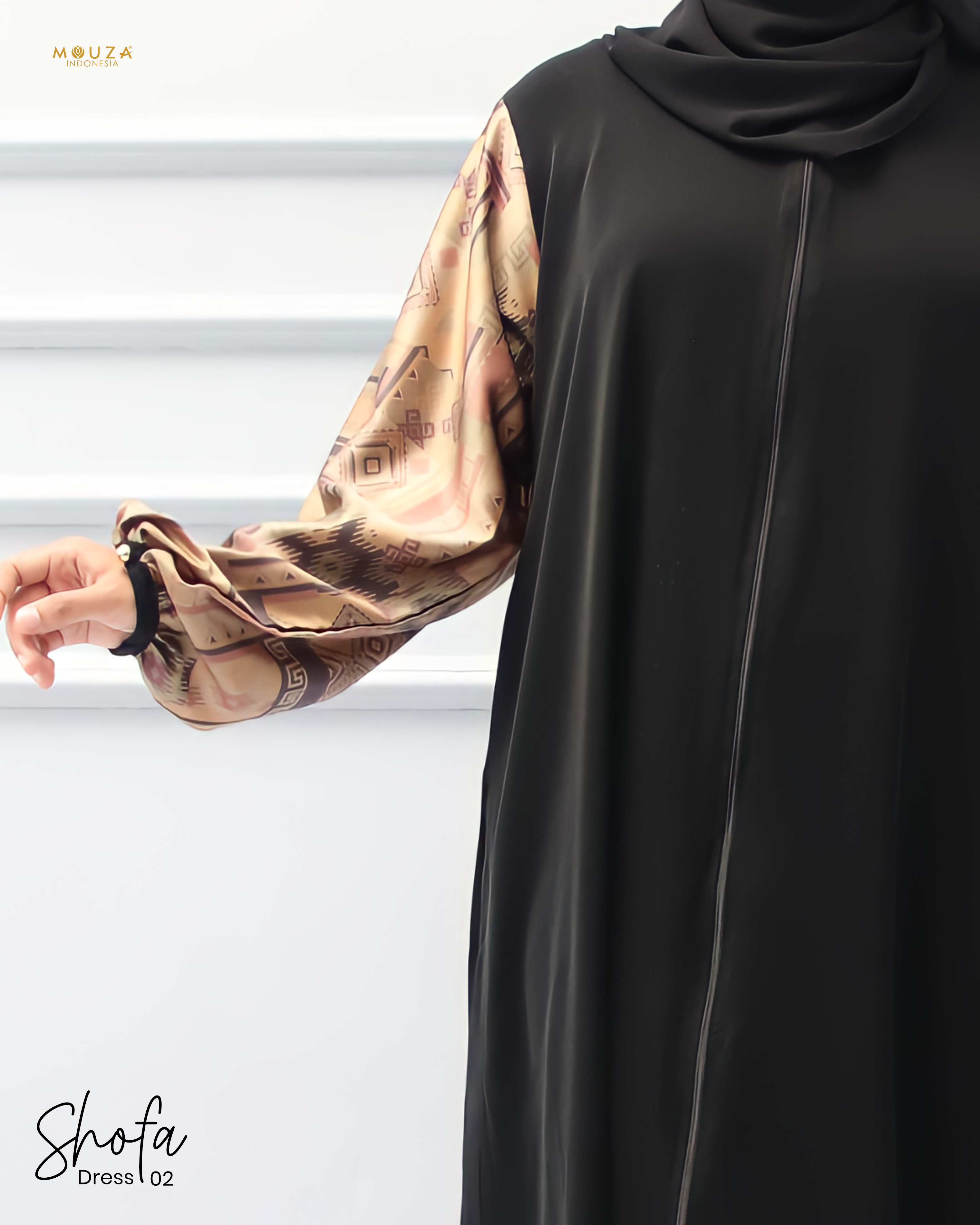 Shofa Dress menggunakan material pokka jetblack dengan karakteristik mempunyai serat yang lembut, adem dan mempunyai warna hitam pekat yang solid.