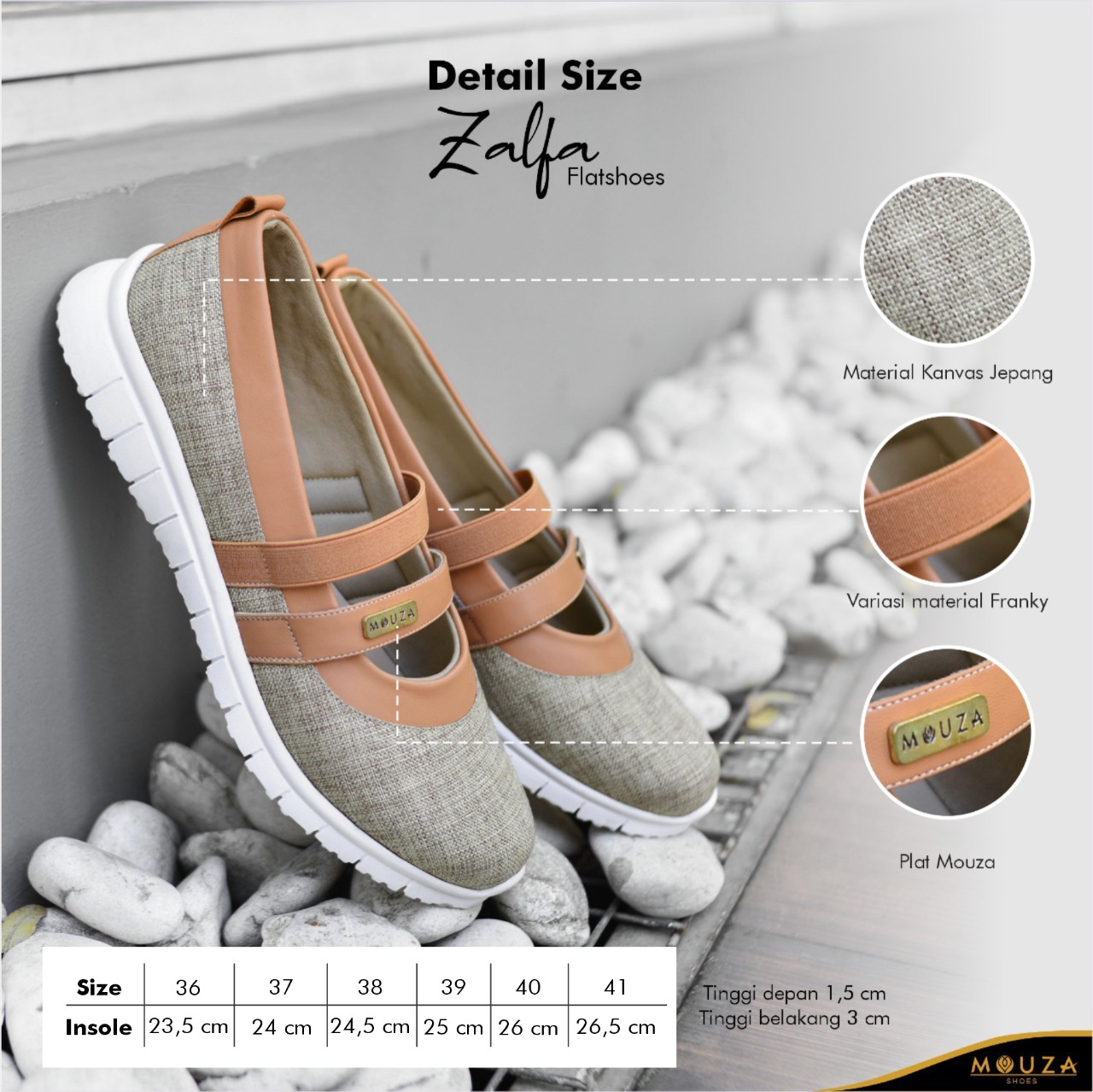 Desain simpel dengan tambahan variasi berbahan franky yang menambah sepatu terlihat simple dan elegan.