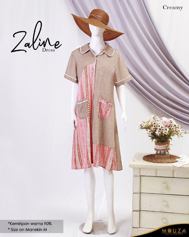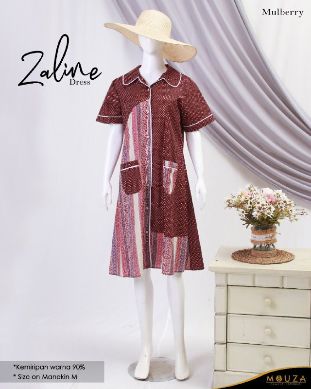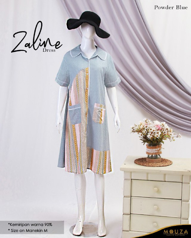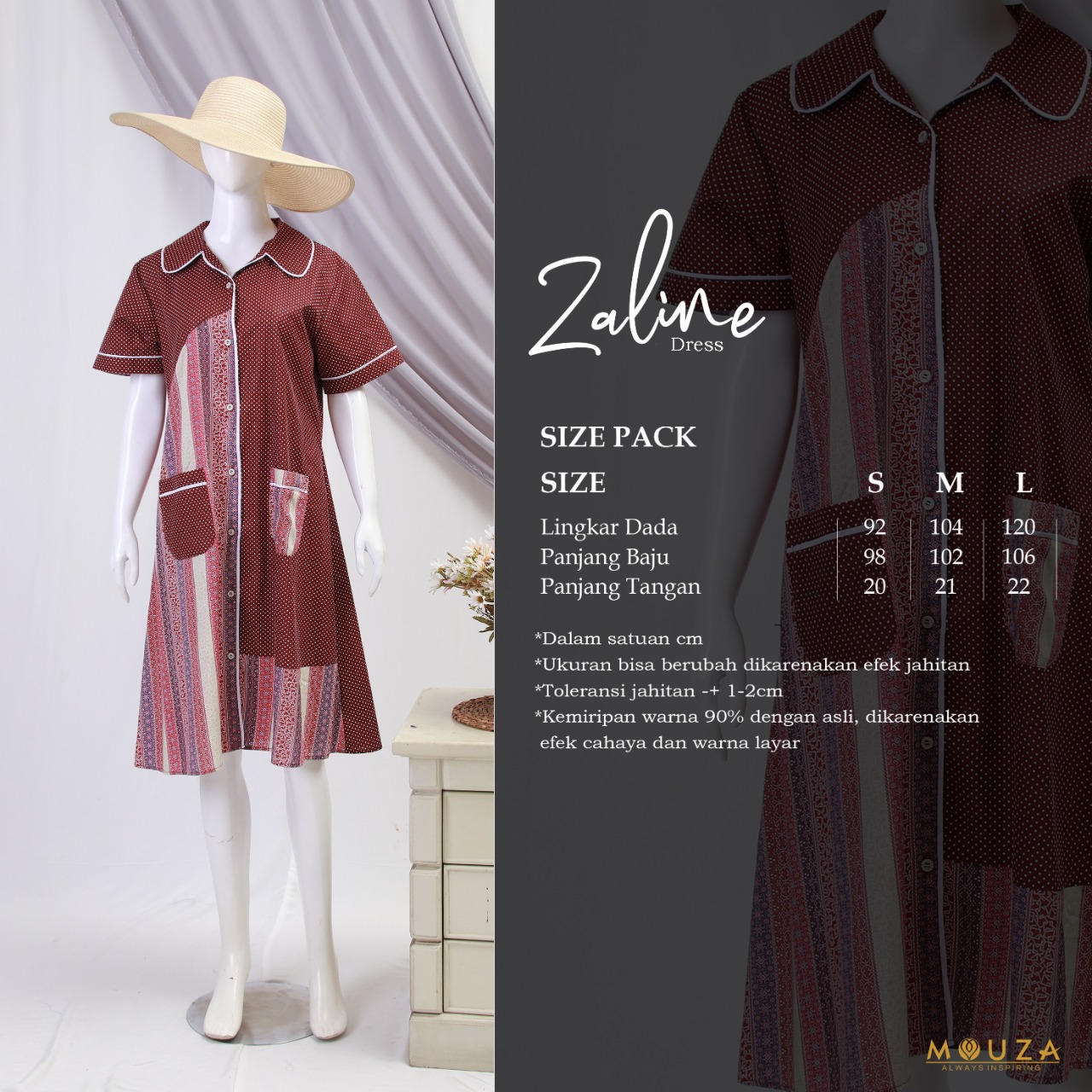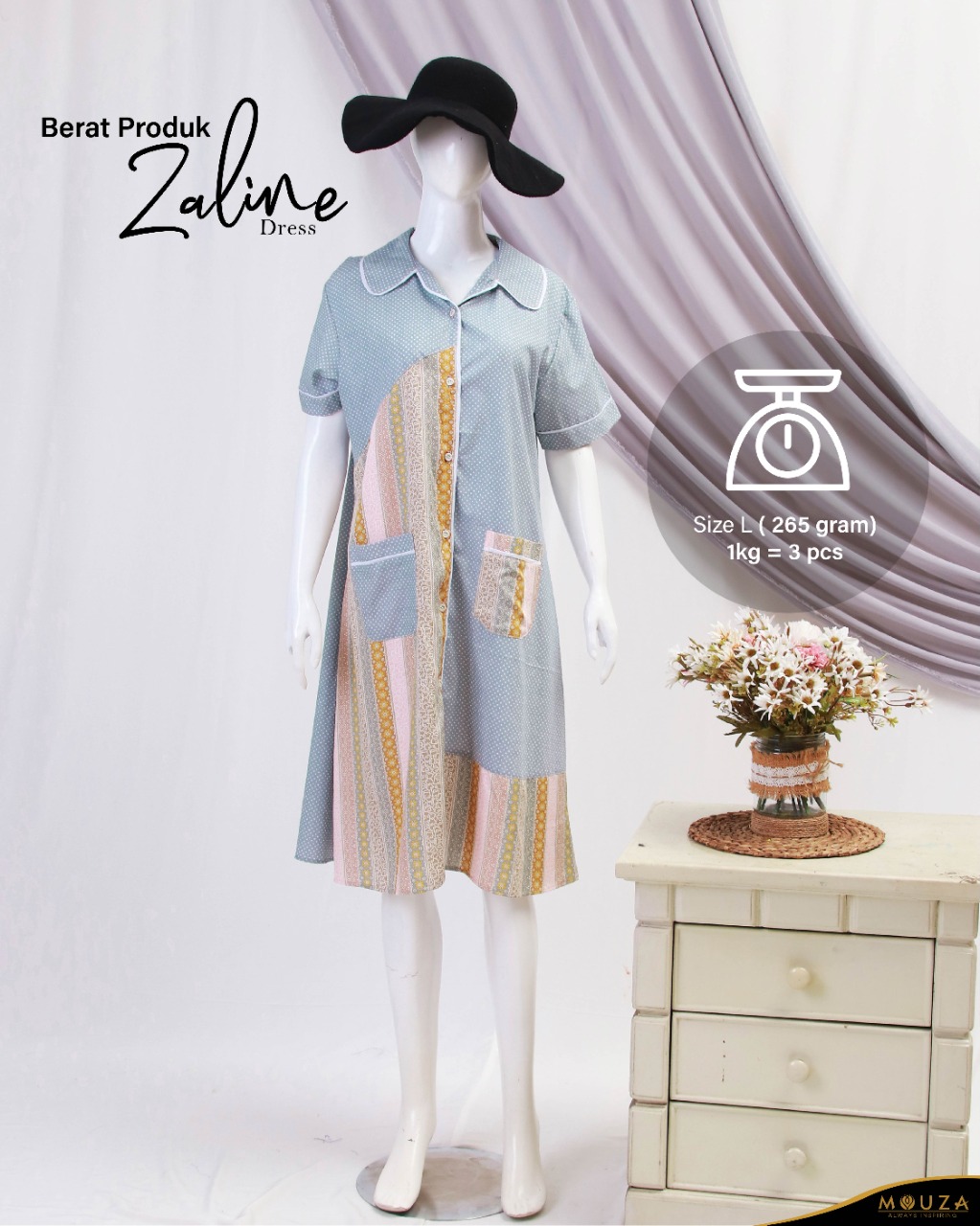 Zaline dress merupakan dress pendek dari Mouza bermaterial katun (motif polkadot) dan rayon (motif patchwork).